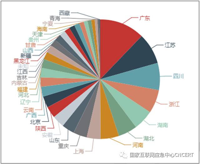 位于境内的控制端按省份统计,广东省占的比例最大,占12.2%;其次是江苏省、四川省和浙江省,如图3所示。